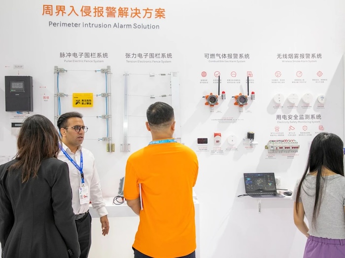 周界入侵報(bào)警解決方案現(xiàn)場(chǎng)展示了脈沖電子圍欄系統(tǒng)和張力式電子圍欄系統(tǒng),由管理軟件、圍欄主機(jī)、控制鍵盤和前端探測(cè)圍欄組成,報(bào)警功能豐富,具備多種聯(lián)網(wǎng)與對(duì)接方式,系統(tǒng)兼容性強(qiáng),可提升周界安全等級(jí),廣泛應(yīng)用于小區(qū)、學(xué)校、工廠、機(jī)場(chǎng)、醫(yī)院等場(chǎng)所的周界防護(hù)。