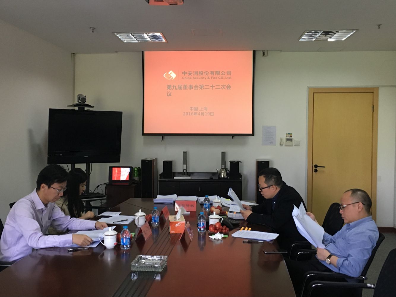 董事會(huì)會(huì)議現(xiàn)場,右排:董事:吳巧民(右二);左排:監(jiān)事:王一科(左二)、陳亞南(左一);董事會(huì)秘書付欣(右一)
