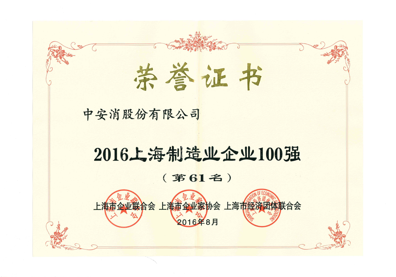 近日,2016上海企業(yè)百強榜正式出爐,中安消科股份有限公司(以下簡稱“中安消”)榮登2016上海民營企業(yè)100強榜單、2016上海制造業(yè)企業(yè)100強榜單。市政府周波副市長、市發(fā)改委葛大維副主任等領(lǐng)導(dǎo)出席榜單發(fā)布會并為獲獎企業(yè)頒獎。