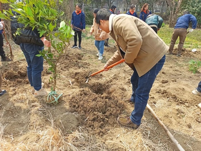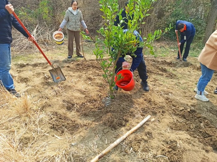 在植樹現(xiàn)場,大家干勁十足,分工協(xié)作,有的揮鍬鏟土、有的細心栽種、有的培土澆水……各個環(huán)節(jié)有條不紊,默契配合。